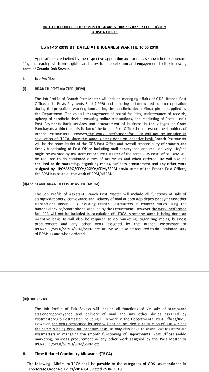 Notification for the post Gramin Dak Sevak (GDS) cycle- II/2019. Application are invited for the post Gramin Dak Sevak under Odisha Postal Circle. The interested and eligible candidates of the selection and engagement to the following posts of Gramin Dak Seval (GDS).